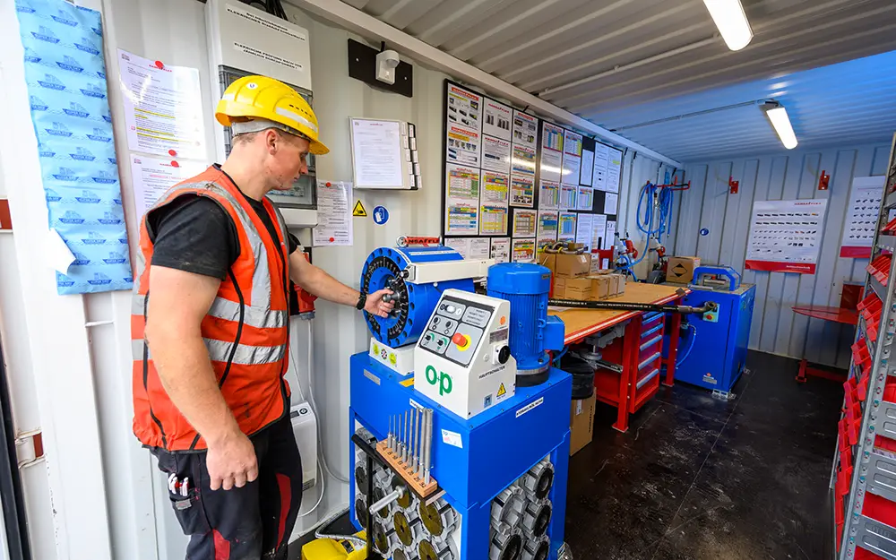 哈格多恩与HANSA-FLEX的合作由来已久。但伊本比伦项目合同的中标并非理所当然。HANSA-FLEX为该燃煤电厂的拆除工作制定了一套极具说服力的方案,将快速移动液压服务车与现场服务集装箱相结合。这彻底避免了往返最近分支机构的耗时路程。服务车与现场服务集装箱之间有着明确的分工:“小口径液压软管可在受影响设备旁的服务车辆内现场制作。这节省了时间,也避免了在25公顷的场地内不必要的往返 ——这是一个不可低估的优势。” 吕德金结合实际经验说道。内径32毫米及以上的大口径液压软管则在现场服务集装箱内制作。集装箱内不仅设有配件仓库,存放接头、软管及紧固件、防弯折保护装置等附件,还配备了设备齐全的车间,可在现场进行液压软管扣压作业。