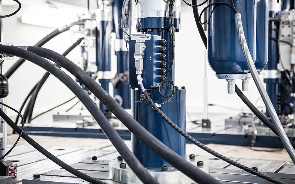 液压技术是TRE七柱式垂直动态测试台的核心所在。两台功率各90千瓦的泵可产生高达280公斤的工作压力,驱动测试台的七个液压执行柱。车辆的车轮安置于液压执行柱上,这些执行柱可各向上向下移动125毫米,以模拟不同的路面状况。此外,另有三个同样由液压驱动的执行柱,用于模拟车辆绕横向和纵向轴线的动态行为,例如制动和加速时的俯仰(点头/后坐)、过弯时的侧倾(摇摆/偏航),以及高速行驶时的下压力。